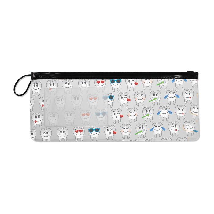 Clear vinyl pouch features tooth emoji face design. There is a business card insert on the front of the pouch for your appointment reminder or business card. Each pouch measures cm. 25×10.