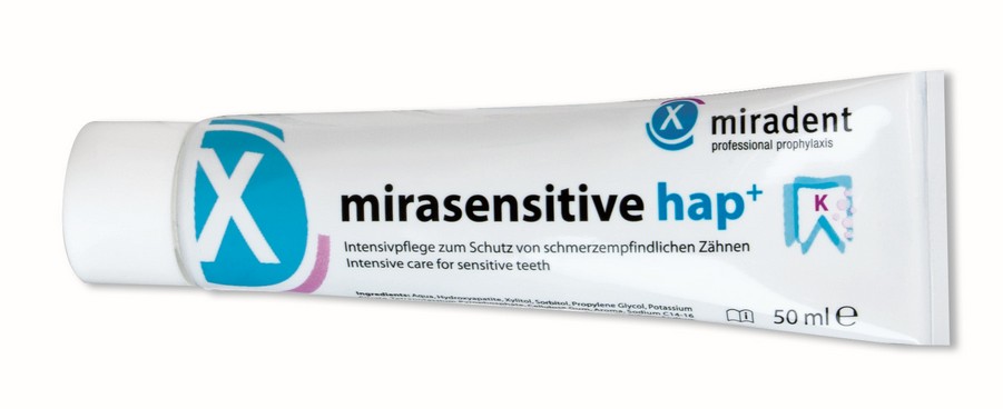 The new “Novamin” substance contained in Mirasensitive HAP + seals open dentinal channels by mineral nanoparticles and promotes the formation of a new enamel (hydroxyapatite carbonate) similar to the natural enamel and therefore prevents the transmission of irritating stimulations to dental nerves